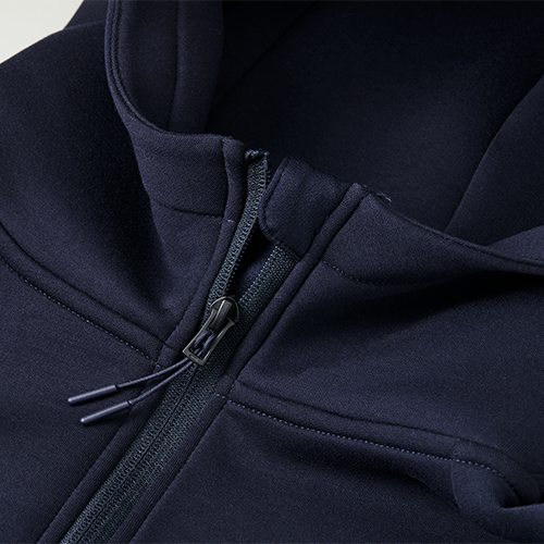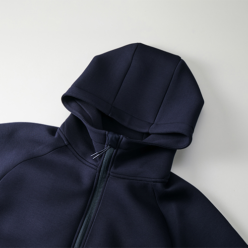 スポーツシーンから街着まで幅広く使える、軽くてあたたかい万能パーカ。多重構造のダンボールニット生地を採用し、空気の層を含むことで優れた保温性と軽やかな着心地を実現しました。シワになりにくく、ストレッチ性も備えているため、アクティブな動きにも快適に対応。表面には控えめな光沢感があり、スポーティーすぎない上品な印象に仕上げています。引き手付きファスナーやチンガード、立体的なフードを支えるハイネック仕様と後ろ台襟など、細部までこだわった設計。トレーニングにもシティユースにも自然に馴染む、完成度の高いテック系パーカです。