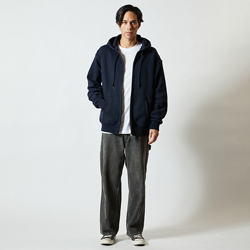 重厚感のある12.7オンス裏パイル生地を使用した、アウター感覚で羽織れるフルジップパーカ。ややゆとりのあるシルエットが都会的な印象を与え、デイリーにも使いやすい一着です。太番手の縫製糸を使ったダブルステッチが、強度と立体感を両立。裏糸には太めのパイル糸を採用し、ふっくらとした質感としなやかな着心地を実現しています。さらに、生地を水洗い・タンブル乾燥させるプリシュランク加工で、洗濯後の縮みを軽減。ダブルファスナー仕様で着こなしの幅も広がり、羽織としても使える万能アイテムです。