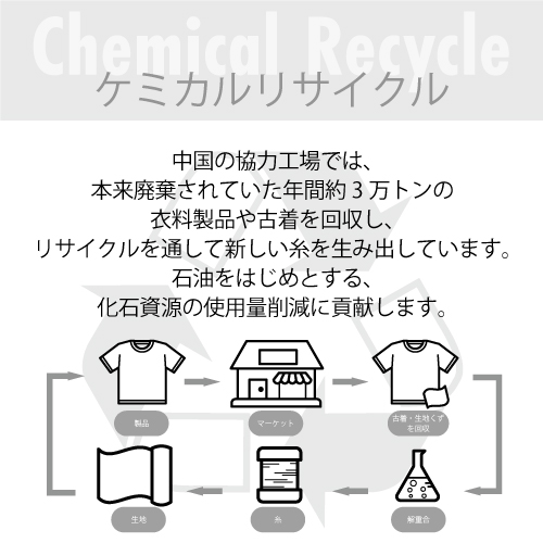 古着が、あなたの1枚に。ケミカルリサイクルのポロシャツは、廃棄されるはずだった衣料品を化学的にリサイクルし、新しいポリエステル糸として生まれ変わり製品が作られています。この革新的な技術が、石油資源の使用量を減らし、持続可能な社会づくりに貢献しているのです。さらに、吸水速乾とUVカット機能も兼ね備えた高機能付き。また、スモールピケのため、ビジネスシーンからカジュアルシーンまで幅広く活躍します!