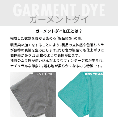 何年も着古したような深みのある風合いを、独自のピグメント染めで再現されたガーメントダイTシャツ。最大の特徴は、着用と洗濯を繰り返すごとに増していく、”自分だけのヴィンテージ感”です。生地を傷めにくい染色技法のため、お気に入りの風合いを長く楽しみながら、タフに使い込める1枚です。
